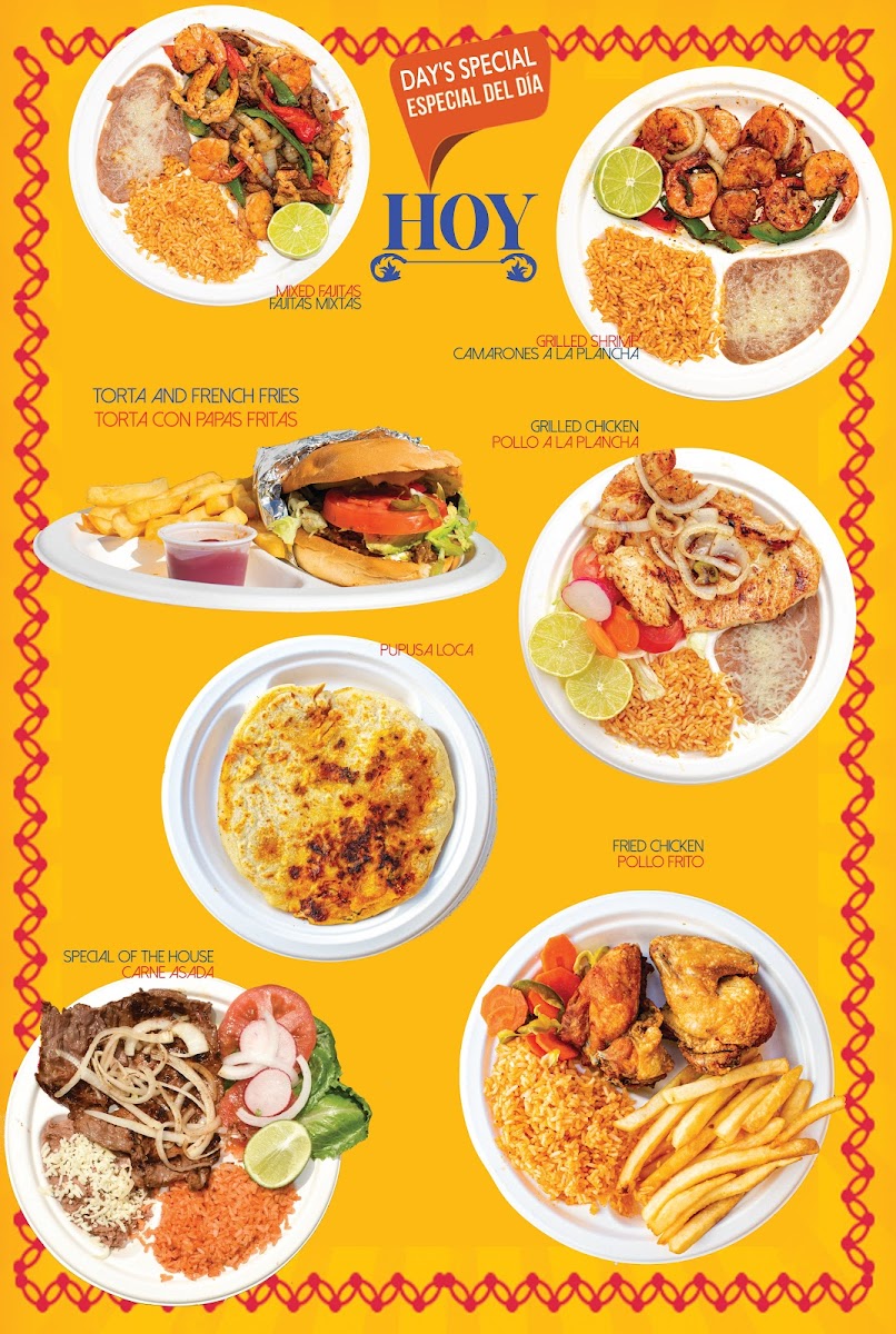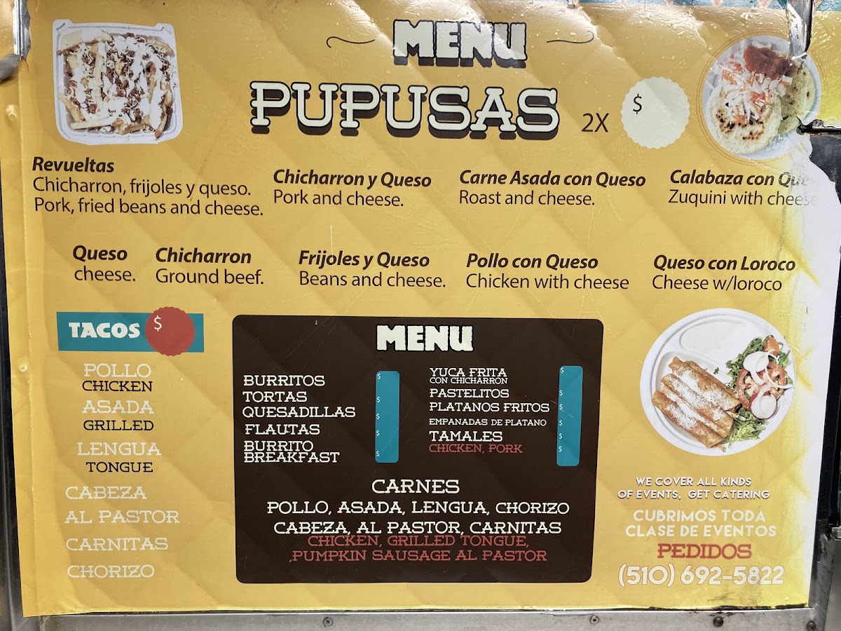 You can expect a variety of traditional pupusas filled with combinations like cheese and chicharrón or zucchini with cheese, alongside satisfying tacos featuring everything from asada and chicken to shrimp and lengua. Snacks like fried yucca, platanos fritos, and pastelitos complement the main offerings with familiar, comforting flavors.